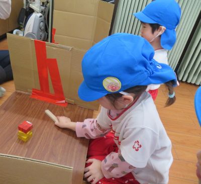 2年生のお姉さん、お兄さんたちが『輪投げ・だるま落とし・こま回し・折り紙・お絵描き・