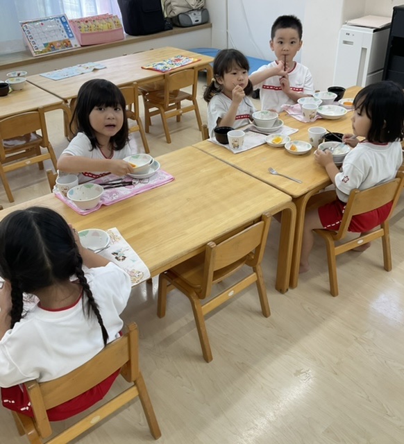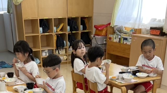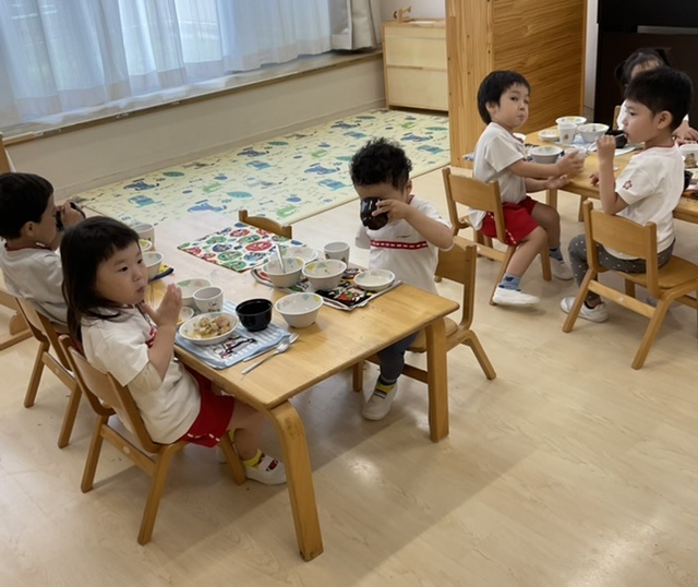 給食タイムです。みんなと一緒に食べると美味しさが倍増。