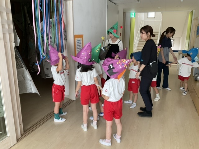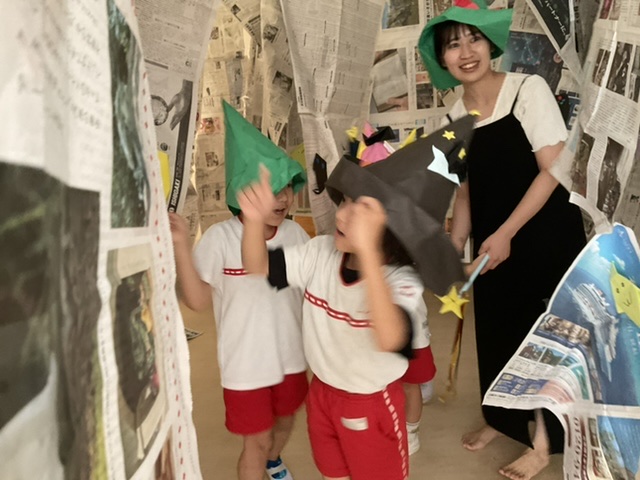 グループに分かれおおはりきりで、新聞迷路、文字釣り、魔法のくすりやさんへ出発。