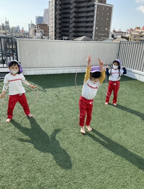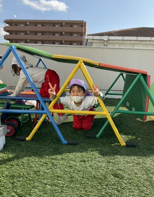 その後は、縄跳びをしたり鉄棒にマットを乗せ、お家に見立てたりして遊びました❗️