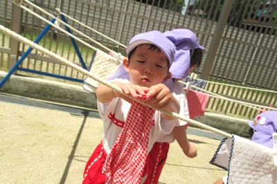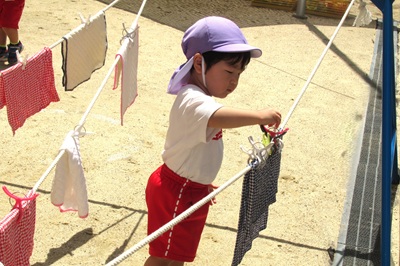 せっけんで上手にあわあわ!汚れを落としたら、洗濯ばさみを使ってロープに干しました☀
