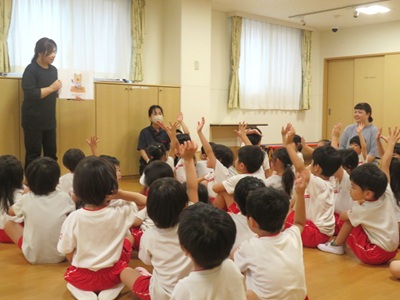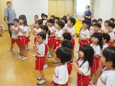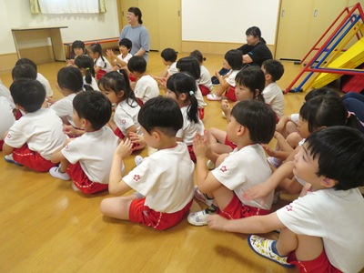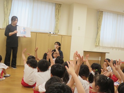 怪我なく楽しく遊べるように、クイズ形式でプール遊びについての約束や大事なことを学びました。