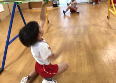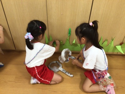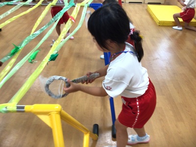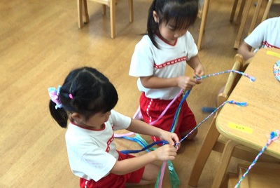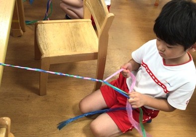 ぞう組さんが、何やらひもを編んでいます。さて、何が始まるのかな?