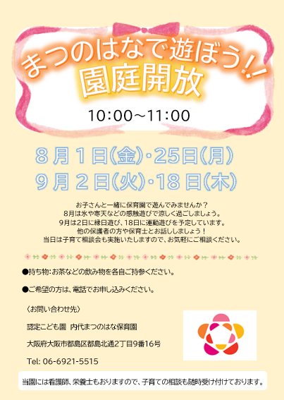 > 施設紹介 > 幼保連携型認定こども園 内代まつのはな保稚園 > 保育園通信 > 園庭開放