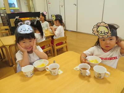 ぞう組ときりん組は同じ食卓で、やきそばやポテトフライなどの屋台風のメニューを楽しみました☆