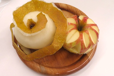 りんごの皮はやわらかいので、彩りよく飾り切りにするときれいだよ!
