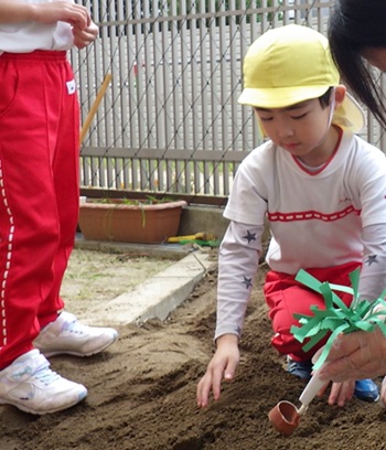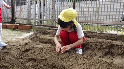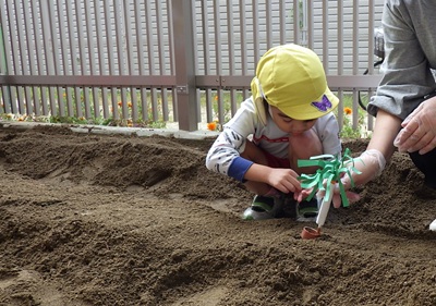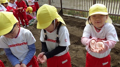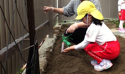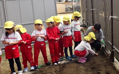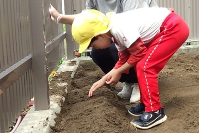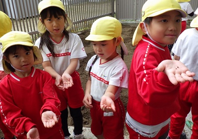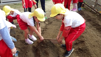先週、さつまいもの収穫を終え、今日はぞう組が大根の種をまきました(^^)/