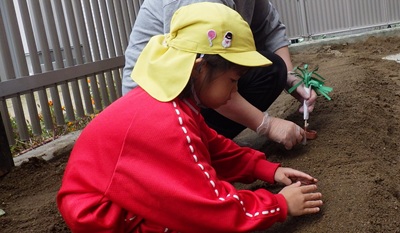大根ステッキで印を付けた場所に種をまいて、土のお布団をかけましょう☆
