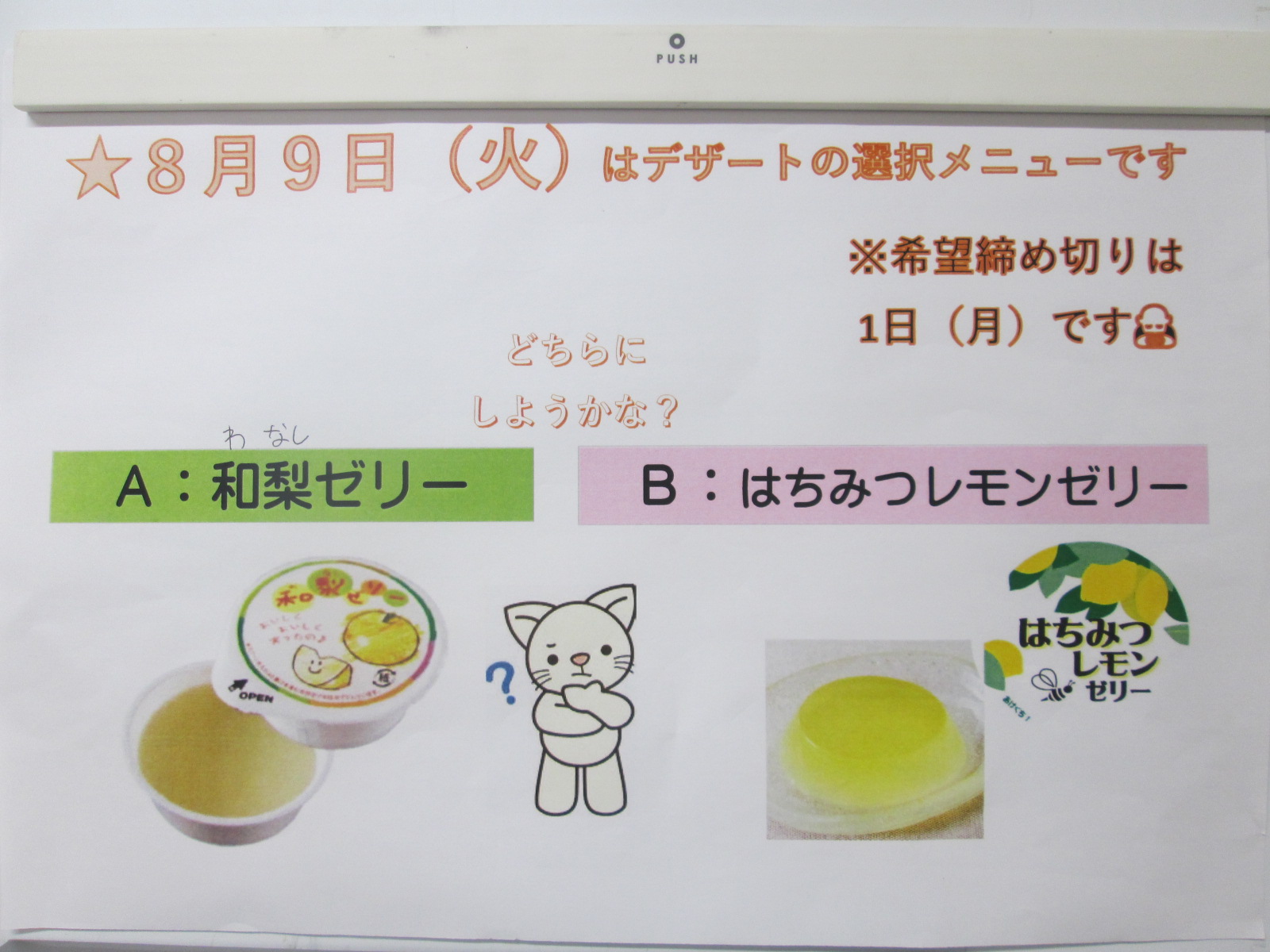 今月の選択メニューはデザートの選択で、和梨ゼリーとはちみつレモンゼリーのどちらかを選べました。