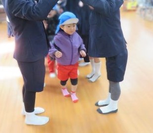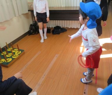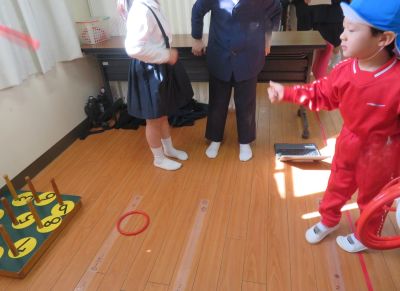 2年生のお姉さん、お兄さんたちが『輪投げ・だるま落とし・こま回し・折り紙・お絵描き・
